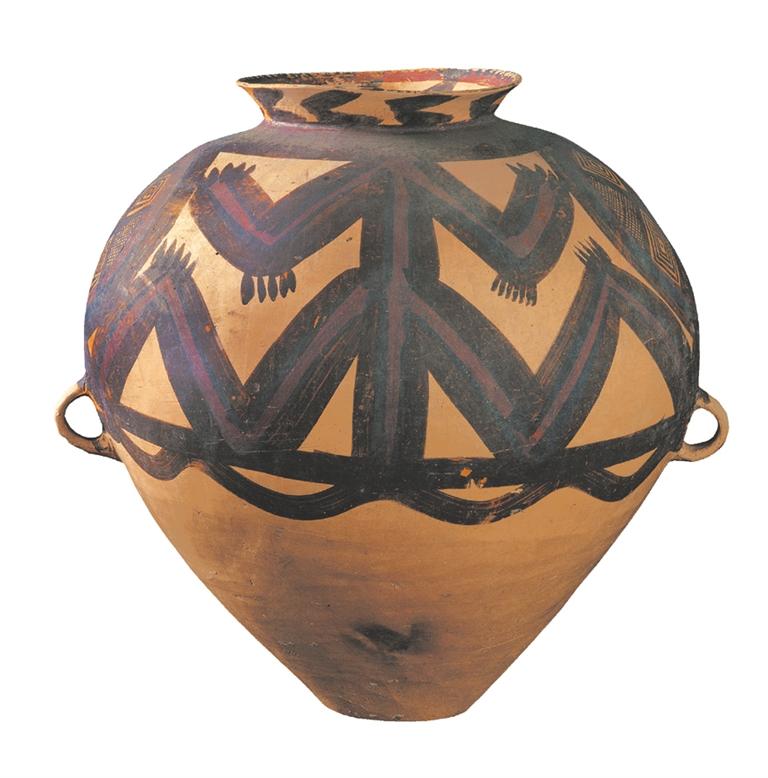 馬家窯文化半山類(lèi)型(距今約 4500 年),廣河縣地巴坪出土。這是雙耳甕器型大氣貴重,施以紅、黑二彩,紅、黑彩交替使用,腹部繪多層連續(xù)垂弧紋和鋸齒紋,黑、紅彩交替使用,由三組分層連續(xù)的垂弧紋組成整體圖案,每層由兩層黑色帶紋和一層紅色帶紋組成,黑色帶紋上緣繪向上的鋸齒紋。整個(gè)圖案密集繁復(fù),俯視猶如一朵盛開(kāi)的鮮花,造型豐滿,色彩鮮艷。