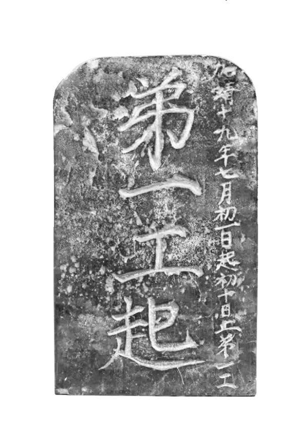 這塊“長城工牌”,高19厘米,寬11.5厘米,厚2厘米。兩面陰刻楷書,共58字,正面豎刻兩行字,共22字,正中刻“弟一工起”四個大字,右邊刻“加靖十九年七月初一日起初十日止第一工”一行小字;背面文字分上下兩部分,共36字。上部刻四個大字“蔡止梅起”。下部豎刻六行32個小字“一工李清隊起,二工梅喜隊,三工王元隊,四工侯勛隊,五工位宗隊,六工張曇隊止”。