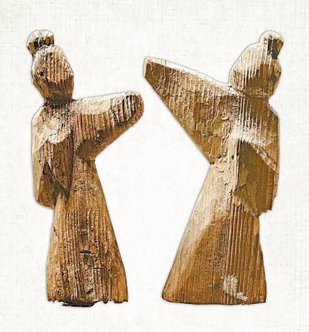 武威磨嘴子漢墓出土,現(xiàn)藏甘肅省博物館的兩件彩繪木舞蹈俑,其中一件寬4.9厘米,厚3.5厘米,高26.7厘米。木俑梳高髻,著長(zhǎng)袍,身體向右傾斜,左臂置于胸前,右臂舉起,頭微側(cè),作舞蹈狀。另一件木俑底寬5.4厘米,高14.5厘米,削制而成。以黑、紅兩色繪五官和衣領(lǐng)等。木俑挽高髻,穿袍服。左臂撫胸,右臂向前上舉起,身子傾斜,作舞蹈狀。它們和同一地點(diǎn)出土的漆樽舞蹈畫一樣,都是現(xiàn)實(shí)生活中官僚貴族富戶舞伎的藝術(shù)再現(xiàn)。
