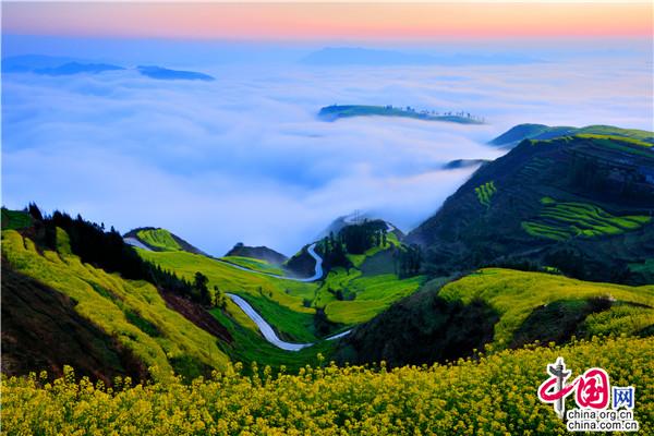 云南省羅平縣無處不風(fēng)景。春季的馬街,桃花、梨花、李花、山茶花、油菜花、杜鵑花、馬纓花把一座座山峰映襯得如詩如畫。佇立牛頭山俯視云層,漫無邊際的白云在山麓翻滾、碰撞、擁擠,雖沒有海的蔚藍(lán)與呼嘯之態(tài),卻有海的浩瀚與壯闊。站在山巔呼吸沁人心脾的清新空氣,聽山風(fēng)掠過林梢的聲音,云霧升騰時如夢如幻,仿佛有仙人騰云駕霧下凡而來。