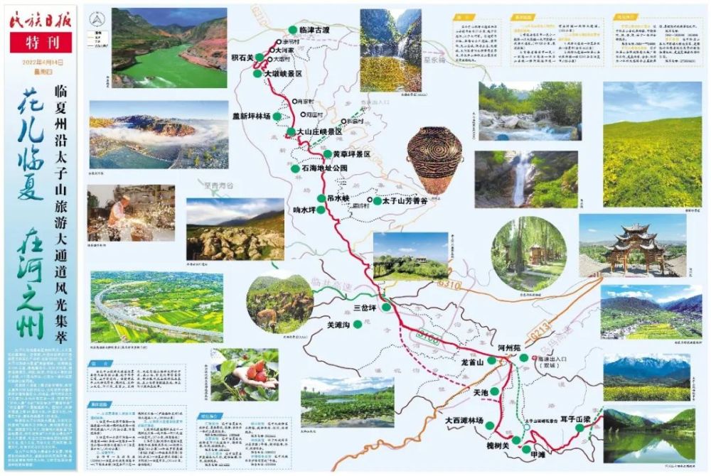太子山沿線是臨夏自然風光、人文景觀的集萃地。近年來,州委州政府在打造臨夏文旅百億產(chǎn)業(yè)時,創(chuàng)新性地打造出“沿太子山旅游大通道”黃金線路。該線路全長286公里,南起蓮花山、北至大河家,涵蓋沿線康樂、和政、臨夏、積石山4縣的28 個鄉(xiāng)鎮(zhèn)、4個國有林場,已成為一條環(huán)臨夏州旅游公路網(wǎng)線。