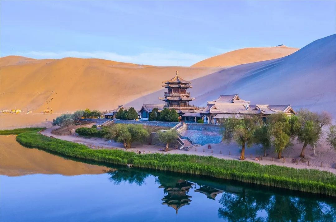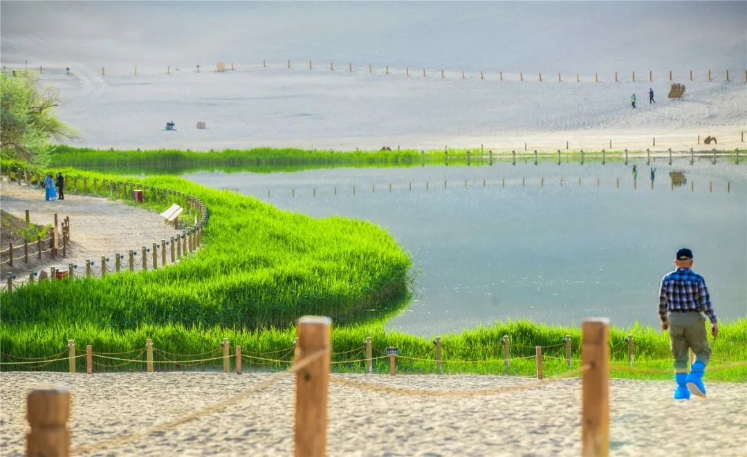 今年4月,敦煌市氣候溫潤(rùn),雨水較多,鳴沙山月牙泉景區(qū)草木蔥蘢,月牙泉水位持續(xù)上升。從4月23日在月牙泉航拍的圖片可以看出,月牙泉水域面積逐漸擴(kuò)大,泉水已滲出月牙泉圍欄之外近1米的距離。據(jù)悉,3年前月牙泉泉水一直保持在圍欄之內(nèi)。