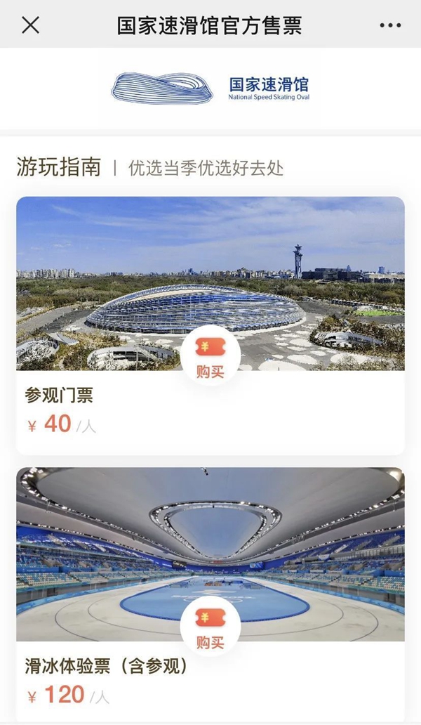 來這里參觀可以通過微信關(guān)注“國家速滑館”公眾號(hào)進(jìn)行票務(wù)預(yù)約。參觀門票40元每人次。參觀加上冰的套票120元每人次。根據(jù)游客需求,也可以現(xiàn)場(chǎng)購買80元每人次的滑冰體驗(yàn)票,其中包含了90分鐘的滑冰體驗(yàn)和一套冰鞋一套護(hù)具。