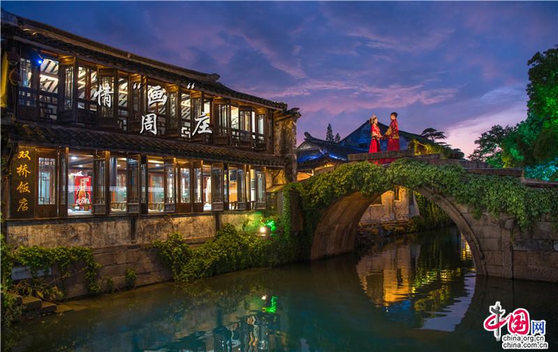雙橋如畫,入畫周莊。牛郎織女七夕鵲橋相會(huì),而我與你邂逅在江南水鄉(xiāng)。人間煙火至,攜手水鄉(xiāng)游,夜色下隱隱約約的古橋,仿佛是叩響幸福之門的鑰匙,溫柔靜默,流淌著時(shí)光,好似走過,便可白頭偕老。