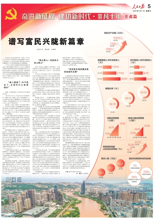 8月7日,人民日報刊發(fā)“奮進(jìn)新征程 建功新時代·非凡十年”甘肅篇,重磅推出兩塊整版,聚焦黨的十八大以來,隴原兒女牢記習(xí)近平總書記的殷切囑托,踔厲奮發(fā)、銳意進(jìn)取,埋頭苦干、勇毅前行,加快建設(shè)幸福美好新甘肅,不斷開創(chuàng)富民興隴新局面。