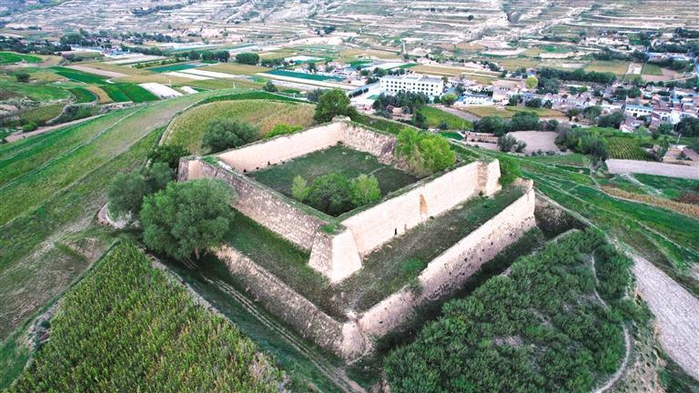 漫步騾子灘,附近的水家坡堡子也值得一去。這個堡子呈正方形,占地超4畝,不管從哪個視角看,都稱得上震撼。堡子分上下兩層,下層高5米、寬5米、邊長55米,上層高6米、底部厚3.5米、頂部厚2米、邊長35.5米。堡子外圍修有一圈寬5米、深6米、總長230余米的壕溝,曾為護(hù)城河。堡子約建于1946-1948年間,用來辦公和防御戰(zhàn)爭。1949年8月,解放軍在水家坡地界圍剿國民黨馬步芳部隊(duì),經(jīng)過一天一夜戰(zhàn)斗,馬步芳部隊(duì)潰敗逃往新營方向,當(dāng)時(shí)有一發(fā)炮彈落在堡子一角,至今炮坑清晰可見。