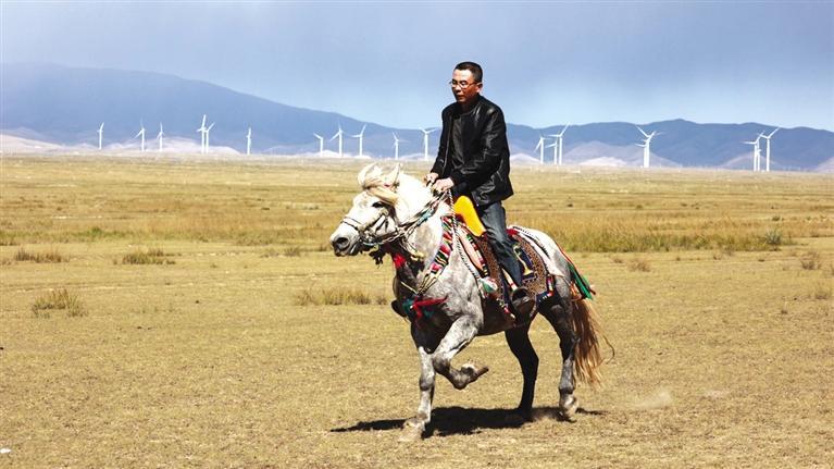 驅(qū)車向草原腹地進(jìn)發(fā),遠(yuǎn)遠(yuǎn)就能看見(jiàn)有人在馴馬。馴馬者房利軍和他的坐騎“尕青”仿佛“人馬合一”,同呼吸、共步調(diào),一遍遍練習(xí),像走,更像飛。這便是傳說(shuō)中的走馬文化,和跑馬的加速度不同,走馬不管是走還是跑,都是快步勻速,短途速度快,長(zhǎng)途耐力強(qiáng),騎乘平穩(wěn),姿態(tài)優(yōu)美,觀賞性強(qiáng)。在牧區(qū),走馬實(shí)用性強(qiáng),深受當(dāng)?shù)厝藲g迎。曾有專家稱,“馬踏飛燕”的“馬”即為走馬。每天,和武威天祝一山之隔的這片草原,都與房利軍有關(guān),在這里,他專心馴馬,而他的500只羊則在一旁撒歡。尤其從高空俯瞰,草原牧羊的畫面甚是壯觀??赐犟Z馬,房利軍騎馬帶路,采訪車沿著馬道回到了“家”。