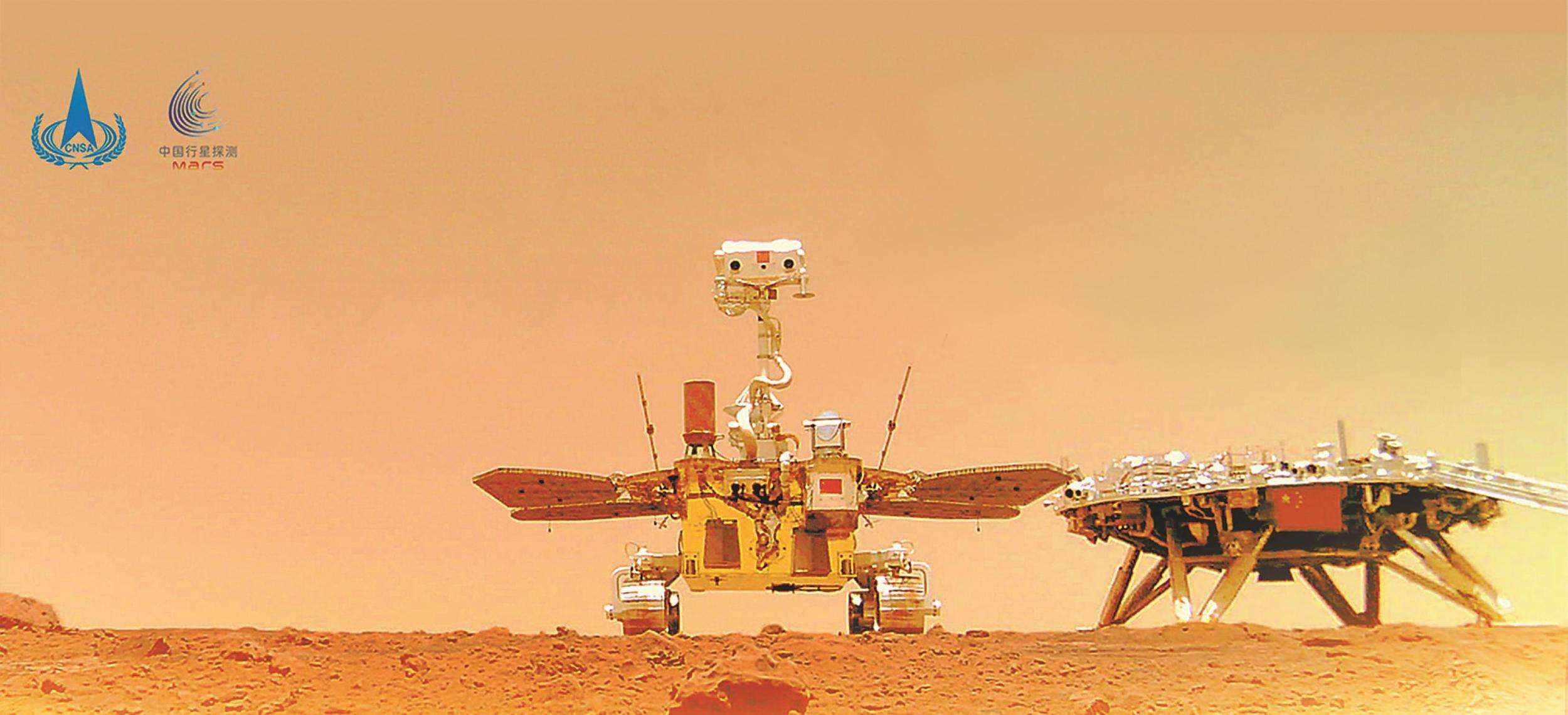 中國(guó)首次火星探測(cè)天問(wèn)一號(hào)任務(wù)“祝融號(hào)”火星車(chē)與著陸器合影。國(guó)家航天局供圖