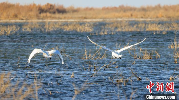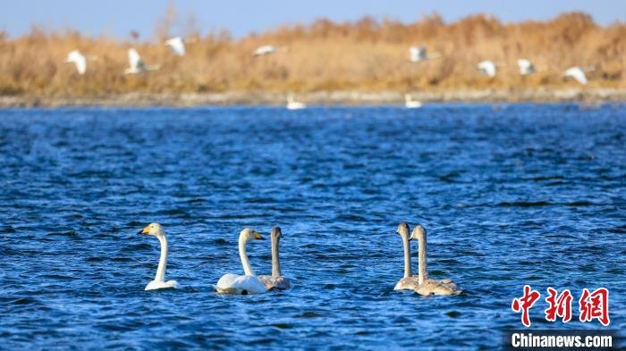 中新網(wǎng)烏魯木齊11月15日電(年磊)11月14日,位于新疆維吾爾自治區(qū)巴音郭楞蒙古自治州博湖縣境內(nèi)的博斯騰湖白鷺洲迎來大批天鵝,它們?nèi)宄扇航Y(jié)伴游弋,嬉戲追逐,優(yōu)雅的身姿成為博斯騰湖一道靈動的風景線。