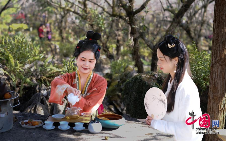 一朵梅花寓五福,一山梅花賀新春。梅原里,游客們或賞花祈福、或獨自品溫,或拍照打卡,盡情享受賞梅樂趣。還有不少游客,為了應(yīng)景,更是穿著古風(fēng)漢服或少數(shù)民族服飾,沉浸式打卡梅花節(jié),游客林女士說:“古裝配梅花,清麗脫俗,既感受到傳統(tǒng)文化之美,也為賞梅之旅增添了色彩。”