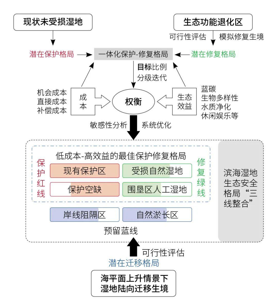 識(shí)別海平面上升和濱海濕地圍墾影響下,濱海濕地生態(tài)系統(tǒng)潛在陸向遷移通道及其遷移格局,劃定適應(yīng)海平面上升的預(yù)留藍(lán)線。
