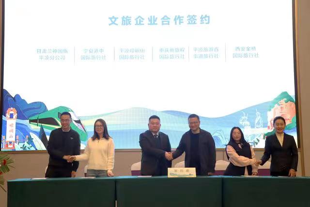 專題推介會(huì)上,平?jīng)鍪形幕瘡V電和旅游局推介了全市文旅資源及“引客入平”系列支持政策,崆峒山、大云寺·王母宮、龍泉寺、云崖寺等重點(diǎn)景區(qū)和涇川橙香瑤池溫泉酒店分別作了主題推介。平?jīng)鑫穆猛豆九c西安一帶一路文旅公司、涇川大云恒盛旅游公司與西安黃河國(guó)旅、崇信公劉文旅投公司與寶雞春暉旅行社、莊浪關(guān)山文旅投公司與寧夏新文化國(guó)旅、崆峒山國(guó)旅與重慶新旅程國(guó)旅、甘肅蘭神國(guó)旅平?jīng)龇止九c寧夏港中國(guó)旅、平?jīng)雎糜伟偈峦ㄅc西安金橋國(guó)旅等14家省內(nèi)外旅行社分別簽訂“引客入平”客源互送合作協(xié)議。推介環(huán)節(jié)還進(jìn)行了《神仙留戀的好地方》《崆峒武術(shù)魂》《折柳》和《春天的芭蕾》等文藝表演,與會(huì)嘉賓參觀了“問道崆峒·養(yǎng)生平?jīng)?rdquo;文旅形象圖片展、文旅產(chǎn)品市集、非遺技藝展示及網(wǎng)絡(luò)直播和非遺文創(chuàng)產(chǎn)品展。甘肅省文旅廳有關(guān)處室、各相關(guān)市州文旅部門負(fù)責(zé)人和省內(nèi)外旅行商、文旅企業(yè)、媒體記者代表,平?jīng)鍪兄攸c(diǎn)景區(qū)、文旅投公司、文創(chuàng)企業(yè)代表共150余人參加。