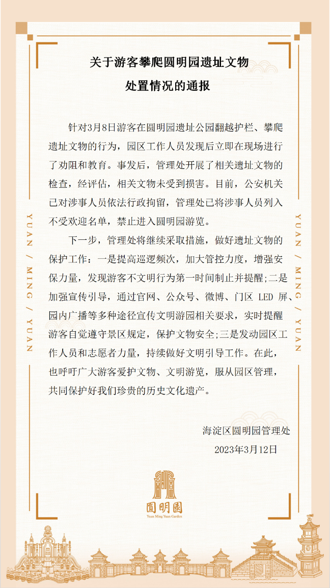 《通報(bào)》指出,針對(duì)3月8日游客在圓明園遺址公園翻越護(hù)欄、攀爬遺址文物的行為,園區(qū)工作人員發(fā)現(xiàn)后立即在現(xiàn)場進(jìn)行了勸阻和教育。事發(fā)后,管理處開展了相關(guān)遺址文物的檢查,經(jīng)評(píng)估,相關(guān)文物未受到損害。目前,公安機(jī)關(guān)已對(duì)涉事人員依法行政拘留,管理處已將涉事人員列入不受歡迎名單,禁止進(jìn)入圓明園游覽。