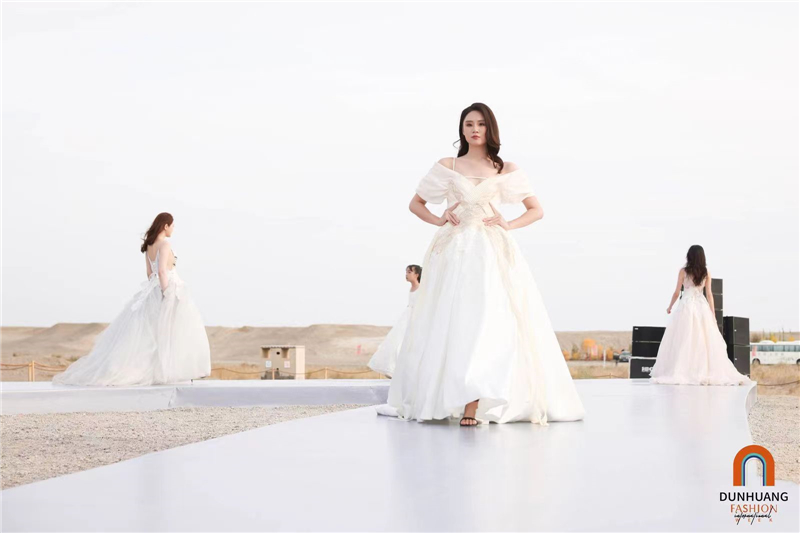 張肇達(dá)表示,時尚秀選在玉門關(guān)遺址,是歷史與自然的結(jié)合。為了辦好這場秀,此前他來到玉門關(guān)采風(fēng),感受過黃沙漫漫,更覺歷史厚重。在這么一個具有中國人文情懷的邊關(guān)走秀,他在婚紗設(shè)計中特別融入了玉門關(guān)外墻的質(zhì)感和流沙的靈動,這些都在新派婚紗中有很好的體現(xiàn)。