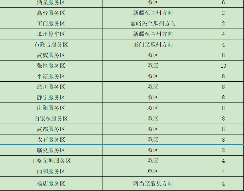 ?。ǘ┲攸c(diǎn)客運(yùn)車站班線。省內(nèi)二級(jí)及以上客運(yùn)站正常營運(yùn),以省會(huì)城市、人口密集市縣的站點(diǎn)及之間的班線為重點(diǎn)。如:蘭州客運(yùn)東站、南站,天水汽車站等站點(diǎn)以及蘭州—定西、蘭州—西峰、臨洮—平川、舟曲—武都、金昌—武威等客運(yùn)班線。 (三)車流量較大服務(wù)區(qū)。預(yù)計(jì)我省車流量較大服務(wù)區(qū)為定西服務(wù)區(qū)、酒泉服務(wù)區(qū)、武威服務(wù)區(qū)、高臺(tái)服務(wù)區(qū)、長(zhǎng)城驛服務(wù)區(qū)、靜寧服務(wù)區(qū)、會(huì)寧服務(wù)區(qū)、太石服務(wù)區(qū)、蘭州北服務(wù)區(qū)、接駕嘴服務(wù)區(qū)、永登服務(wù)區(qū)。
