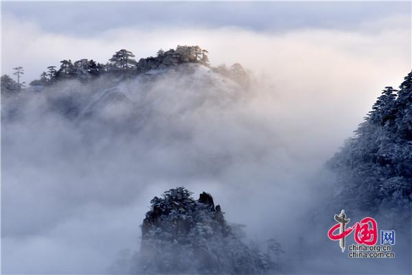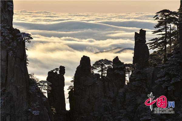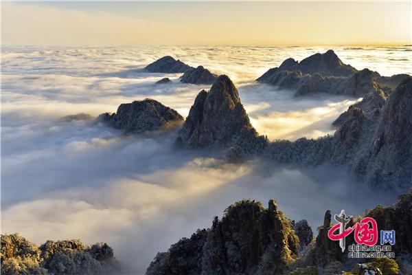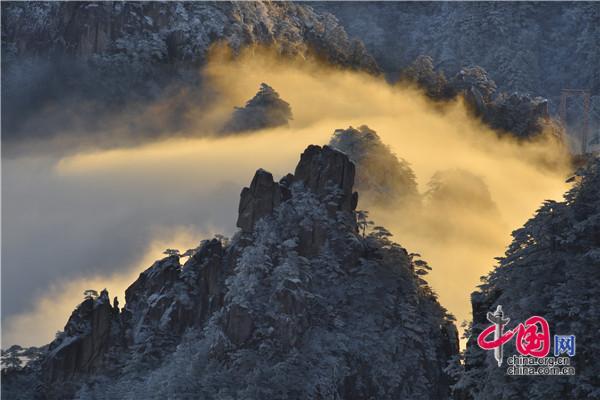 冬天的黃山絕美之處莫不過于雪景、霧凇、日出、云海同時出現(xiàn),1月5日雪后早晨一輪紅日冉冉升起,在陽光的照耀下,放射出萬丈光芒,在群峰間、奇松怪石上散發(fā)著金燦燦的光彩,給冬景增添神奇的色彩,美輪美奐宛如油畫。
