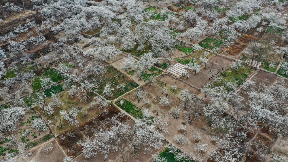 這是3月9日在隴南市武都區(qū)城關(guān)鎮(zhèn)石家莊村拍攝的櫻桃花(無(wú)人機(jī)照片)。 新華社記者 陳斌 攝