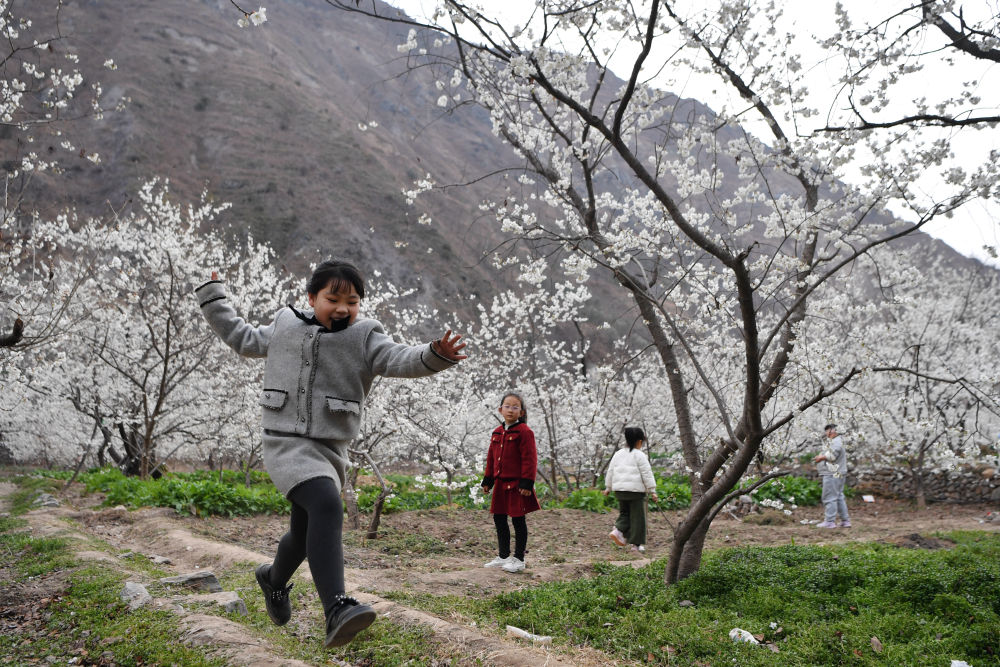 3月9日,幾名小朋友在隴南市武都區(qū)城關(guān)鎮(zhèn)石家莊村的櫻桃樹下玩耍。新華社記者 陳斌 攝