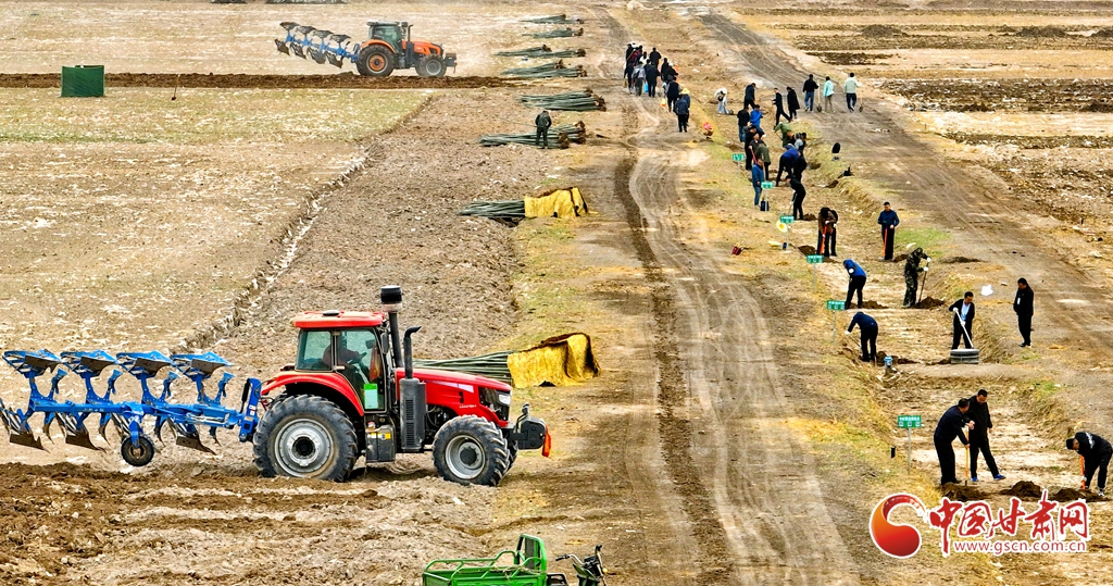 4月9日,甘肅省張掖市甘州區(qū)三閘鎮(zhèn)高寨村義務植樹基地上,千名當?shù)馗刹柯毠ず椭驹刚邆儞]鍬鏟土挖樹坑,掀起農(nóng)田防護林建設和防沙治沙春季植樹造林熱潮。