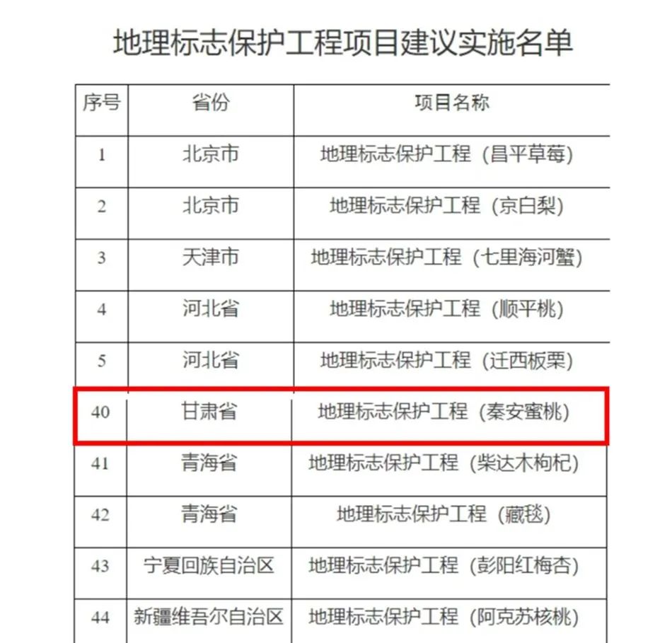 日前,國家知識產權局辦公室發(fā)布《關于2024年地理標志保護工程實施名單的公示》,經省級知識產權局審核推薦,國家知識產權局對申報推薦名單進行綜合評審,擬定2024年地理標志保護工程實施名單。其中《秦安蜜桃》榜上有名,是甘肅省唯一入選項目。
