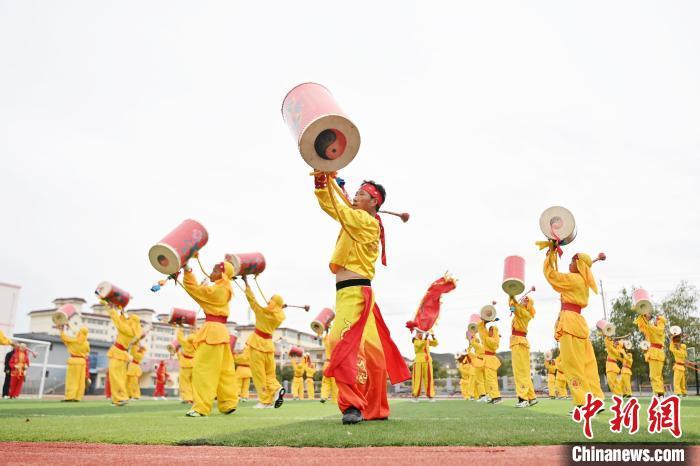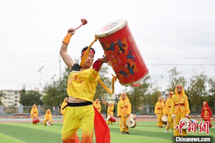 9月9日,甘肅省蘭州市皋蘭縣三川口學(xué)校學(xué)生練習(xí)蘭州太平鼓。近年來,皋蘭縣將國家級非物質(zhì)文化遺產(chǎn)蘭州太平鼓納入各中小學(xué)課后服務(wù)內(nèi)容,成立中小學(xué)太平鼓隊13支,定期邀請非遺傳承人走進校園,進行傳統(tǒng)文化授課和培訓(xùn),使學(xué)生親身感受中華優(yōu)秀傳統(tǒng)文化的魅力。蘭州太平鼓舞已有六百余年的歷史,素有“天下第一鼓”之稱,2006年被列入中國第一批非物質(zhì)文化遺產(chǎn)名錄。中新社記者 九美旦增 攝