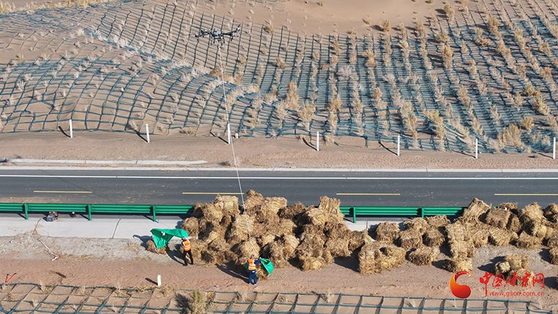 防沙治沙又一季,綠化造林年復年。這幾天,在金塔縣城至大墩門公路“三北”工程防沙治沙現(xiàn)場,一捆捆稻草正排著隊乘坐無人機前往沙漠深處。走進壓沙現(xiàn)場,大家拉草埋沙,手提肩扛,或俯身鋪草,或揮鍬壓埋、填沙整型,分工明確、干勁十足。一臺壓沙車正在作業(yè),車輪駛過,稻草沙障便被植入沙漠里,劃線、鋪草、壓草,整個流程一氣呵成,效率大大提高。