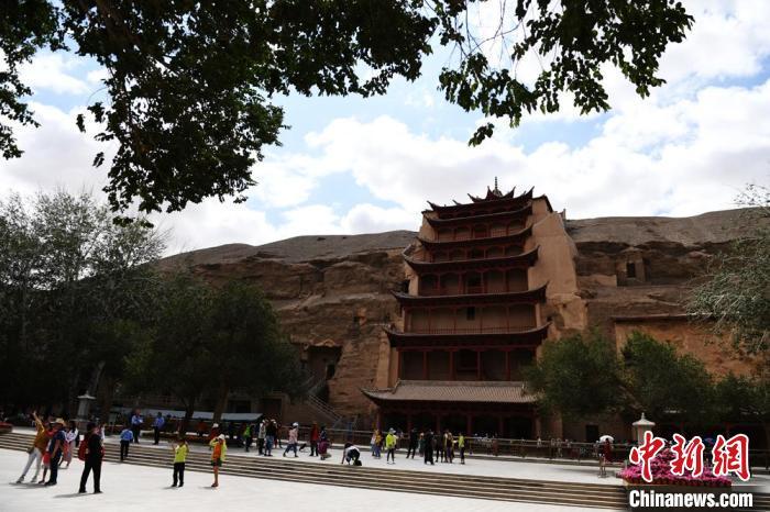 圖為游客在莫高窟九層樓前合影留念。(資料圖) 楊艷敏 攝
