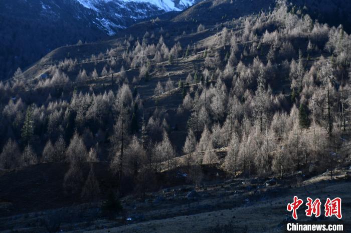 12月2日,四川省阿壩州小金縣四姑娘山雙橋溝植被夕陽(yáng)照射,形成一幅美麗畫卷。中新社記者 張浪 攝