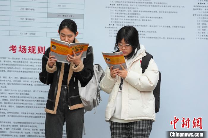 圖為考生在考場外抓緊復(fù)習(xí)。中新社記者 楊華峰 攝