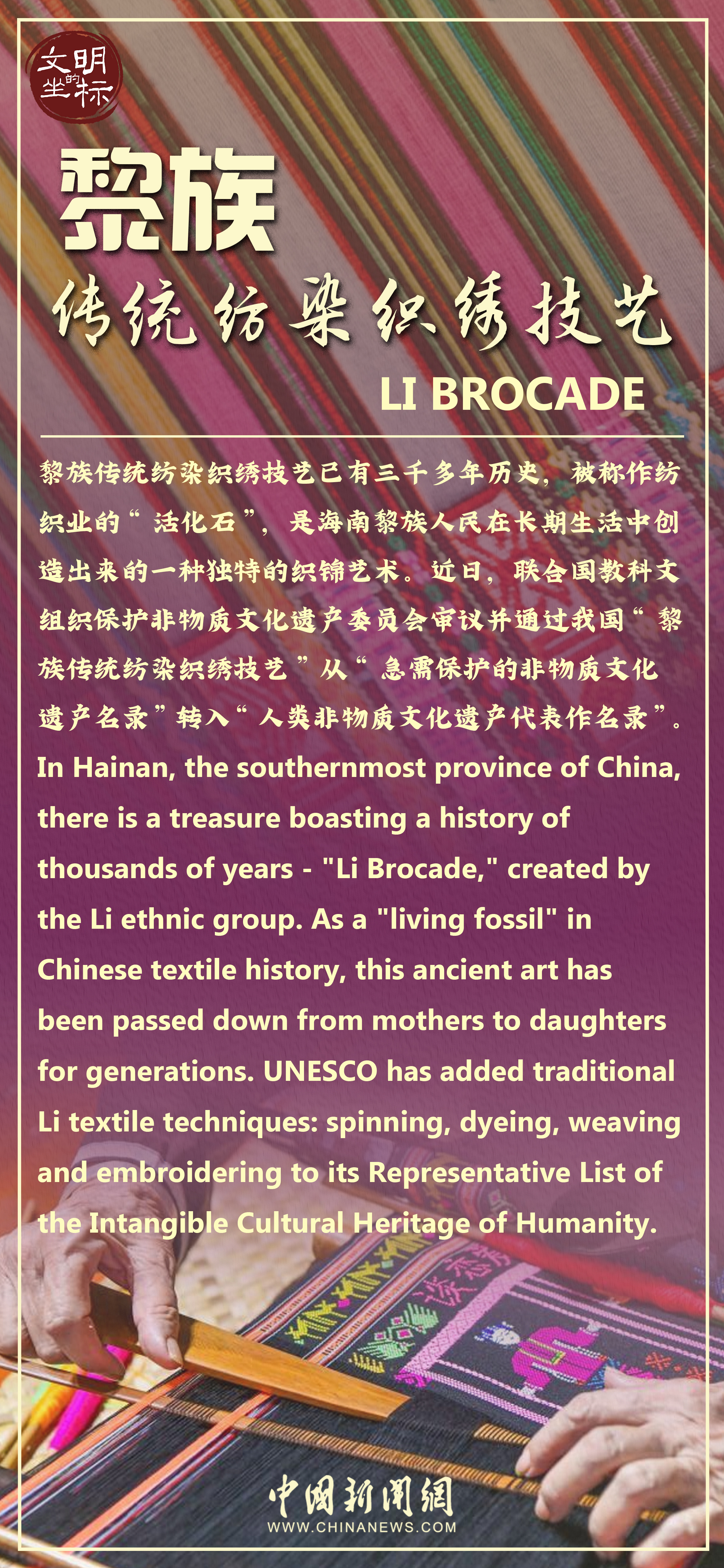 日前,黎族傳統(tǒng)紡染織繡技藝從聯(lián)合國(guó)教科文組織“急需保護(hù)的非物質(zhì)文化遺產(chǎn)名錄”轉(zhuǎn)入“人類(lèi)非物質(zhì)文化遺產(chǎn)代表作名錄”,引發(fā)關(guān)注。黎族傳統(tǒng)紡染織繡技藝已有三千多年歷史,被稱(chēng)作紡織業(yè)的“活化石”。對(duì)于沒(méi)有創(chuàng)造文字的黎族,黎錦像是一本“史書(shū)”,寫(xiě)就了這個(gè)民族的文化和智慧。早在新石器時(shí)代,海南島上的黎族先民已會(huì)使用工具制作繩索或絲線。西漢時(shí)期,已織造出精美的“廣幅布”。至宋代,黎族的紡織達(dá)到很高水平。元代,黎族紡織工藝已傳至全國(guó)。黎族傳統(tǒng)紡染織繡技藝有麻織、棉織、織錦、印染(包括扎染)、刺繡、龍被等品種,以色彩鮮艷、圖案多樣、工藝精湛而聞名。如今,古老黎錦正穿越歷史長(zhǎng)河,以時(shí)尚化、潮流化、年輕化的設(shè)計(jì)形態(tài)融入現(xiàn)代日常生活。