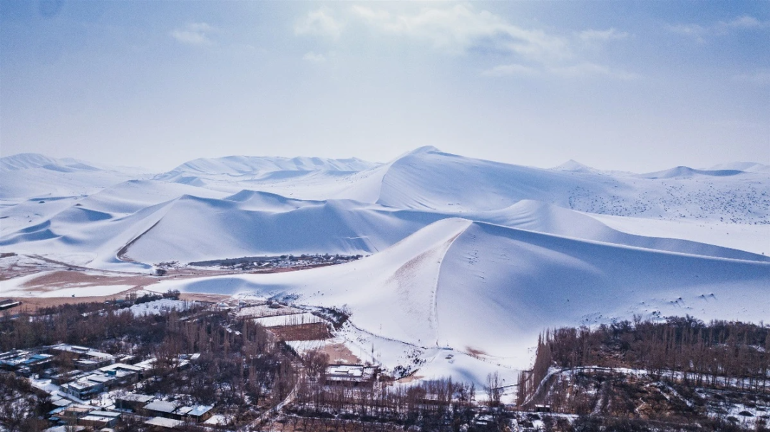 雪后的沙漠,以往那金波起伏、沙紋縱橫宛如流動(dòng)樂(lè)章的山體,此刻被厚雪溫柔掩蔽,連綿峰巒似是大地涌起的雪浪。