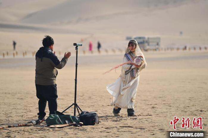 1月13日,甘肅敦煌鳴沙山月牙泉景區(qū)內,游人進行旅拍。中新社記者 李亞龍 攝