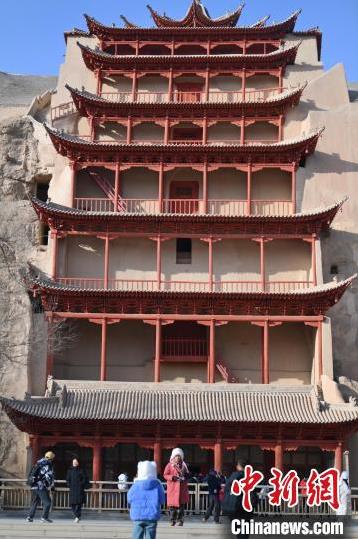 1月13日,甘肅敦煌莫高窟景區(qū)內,游人在莫高窟標志性建筑九層樓前拍照打卡。據(jù)了解,從2024年12月1日至2025年2月28日,當?shù)伉Q沙山月牙泉、玉門關、敦煌雅丹世界地質公園等景區(qū)對國內外所有游客免門票,莫高窟門票實行半價優(yōu)惠,開放洞窟由8個增加至10個,為游客提供了更為豐富的觀賞內容。中新社記者 李亞龍 攝