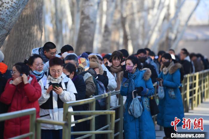 1月13日,甘肅敦煌莫高窟景區(qū)內,游人在工作人員引導下排隊參觀。中新社記者 李亞龍 攝