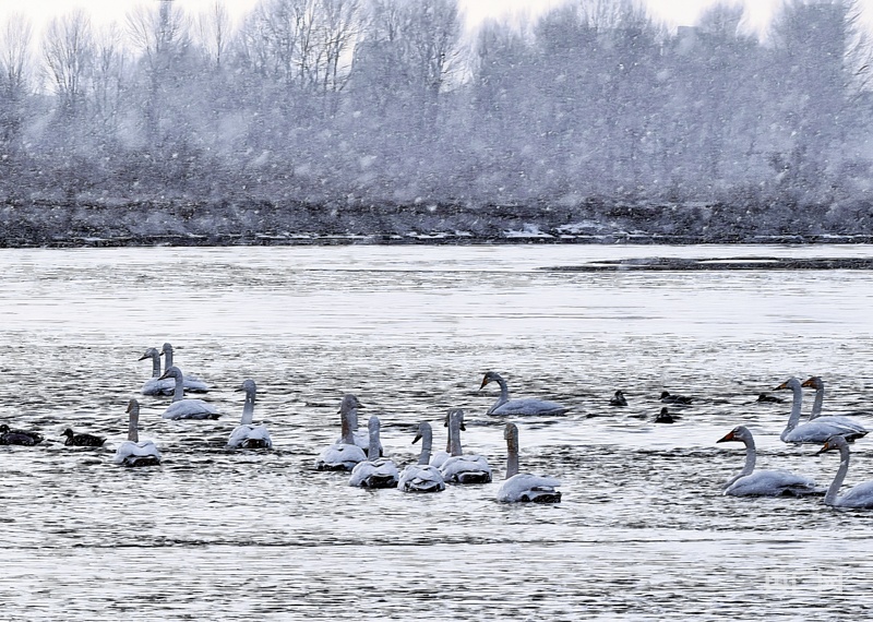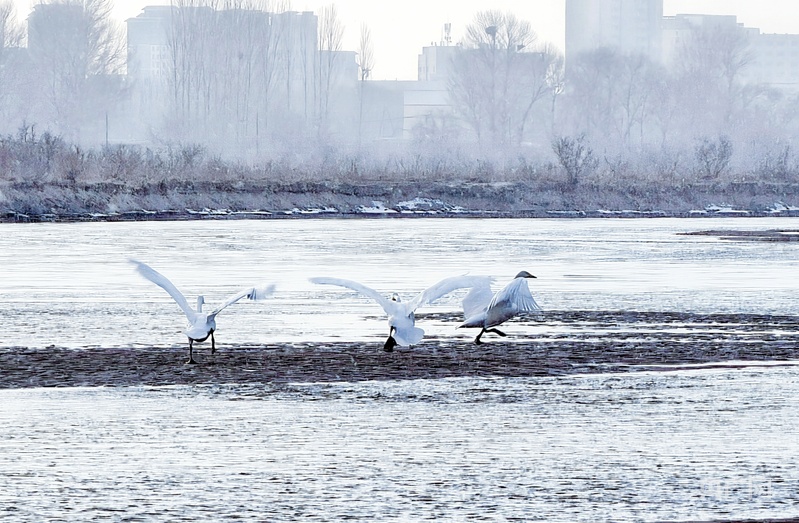 雪落黑河濕地 大天鵝演繹靈動(dòng)之美