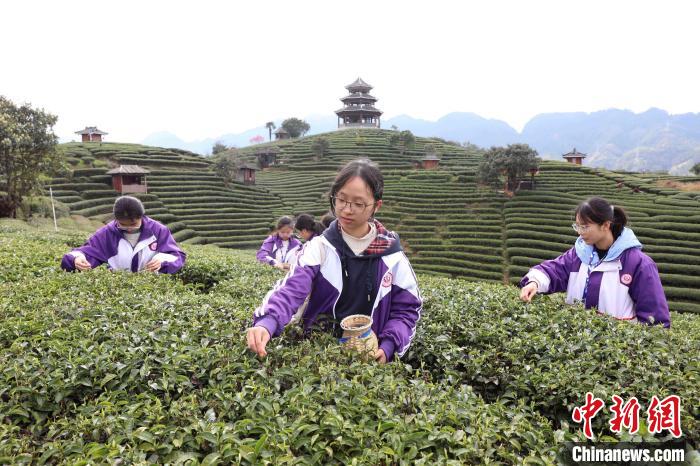 圖為學(xué)子在采春茶。龔普康 攝