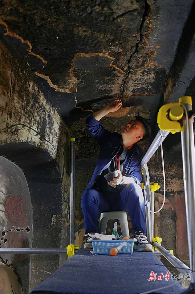 與窟外喧囂不同,在第30窟內(nèi),身著工裝的文物修復(fù)師緊握刀柄、輕刮泥土,讓壁畫和塑像重現(xiàn)昔日光彩。他們用巧手和匠心,靜靜地觸摸著“光陰的故事”。