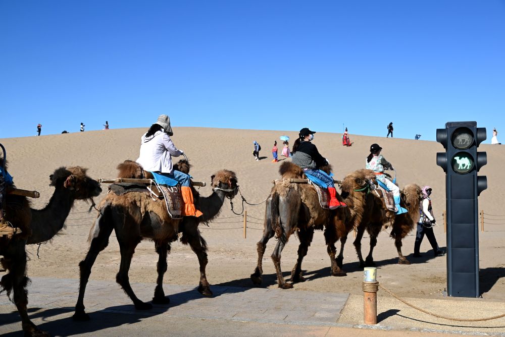 5月24日,敦煌市鳴沙山月牙泉景區(qū)的交通信號(hào)燈“綠駱駝燈”亮起時(shí),農(nóng)戶牽著駱駝?dòng)行蛲ㄟ^(guò)。敦煌市鳴沙山月牙泉景區(qū)設(shè)置具有駱駝元素的交通信號(hào)燈,保障了景區(qū)交通安全順暢。新華社發(fā)(張曉亮攝)