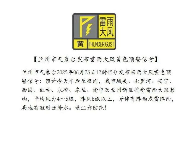 蘭州市氣象臺2025年06月23日12時45分發(fā)布雷雨大風(fēng)黃色預(yù)警信號:預(yù)計今天午后至夜間,我市城關(guān)、七里河、安寧、西固、紅古、永登、皋蘭、榆中及蘭州新區(qū)將受雷雨大風(fēng)影響,平均風(fēng)力4~5級,陣風(fēng)8級以上,并伴有陣雨或雷陣雨,局地有短時強(qiáng)降水。請注意防范!