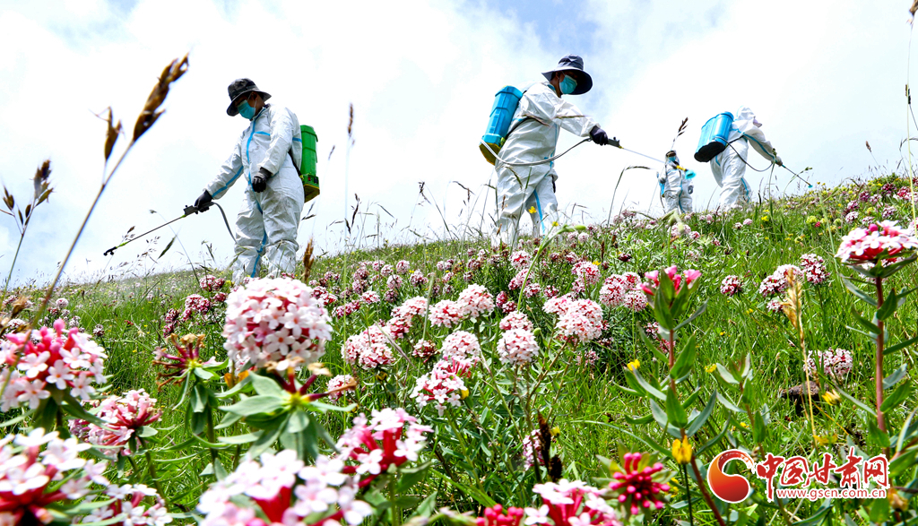 盛夏時(shí)節(jié),位于張掖市肅南裕固族自治縣的皇城夏日塔拉草原、康樂(lè)賽汗塔拉草原,宛如一塊巨大的綠色絨毯鋪向天際,滿目翠綠,令人心醉神迷。然而,此時(shí)也正是草原上狼毒花毒害草盛放、蝗蟲(chóng)繁殖的高峰期。連日來(lái),肅南縣林草專(zhuān)業(yè)技術(shù)人員帶領(lǐng)2000多牧民,抓住毒害草開(kāi)花、蝗蟲(chóng)繁殖最快,也是清除滅殺的最佳時(shí)機(jī),在“三北”工程六期160多萬(wàn)畝廣袤的草原上,打響了以“蟲(chóng)害防治+害草治理+噴施葉面+播撒草籽的”為核心的“三北”工程林草濕荒一體化保護(hù)修復(fù)攻堅(jiān)戰(zhàn)。
