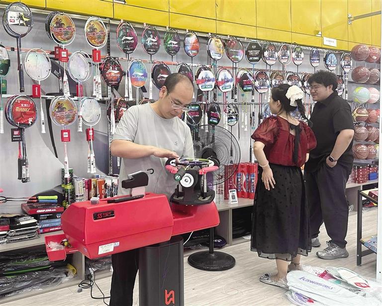 不僅如此,運(yùn)動(dòng)用品銷售也迎來(lái)小高峰。瑞德摩爾太平洋商場(chǎng)內(nèi)的健雄體育用品店內(nèi),老板正忙著給羽毛球空拍穿線。“我們不僅有現(xiàn)成的羽毛球拍,還可以根據(jù)客戶的需求給空拍穿線。”該店老板介紹,羽毛球拍網(wǎng)線價(jià)位30至100元不等,購(gòu)線還可免手工費(fèi)。羽毛球初學(xué)者一般都會(huì)買成品拍自己在家練習(xí),而一些技術(shù)較好的顧客除了會(huì)選擇品質(zhì)較好的空拍,還會(huì)現(xiàn)場(chǎng)選線拉網(wǎng)定制屬于自己的球拍。“暑假以來(lái),店內(nèi)羽毛球拍銷量大增,穿線需求也逐漸增多,周末從早忙到晚,每半小時(shí)穿一個(gè)球拍,最多一天穿24個(gè),排隊(duì)等候已成常態(tài)。”此外,不少運(yùn)動(dòng)品牌也順勢(shì)推出促銷活動(dòng),吸引消費(fèi)者選購(gòu)。