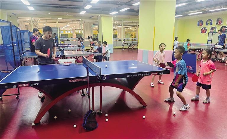 國(guó)芳G99一家乒乓球培訓(xùn)機(jī)構(gòu)內(nèi)每張球桌前都有教練指導(dǎo)學(xué)員練習(xí)。“暑期班從7月10日持續(xù)至8月24日,針對(duì)零基礎(chǔ)學(xué)員推出一對(duì)一火箭課培訓(xùn)。目前,教練時(shí)段全滿員,報(bào)班需要提前預(yù)約。”該機(jī)構(gòu)負(fù)責(zé)人介紹,機(jī)構(gòu)共推出苗子班、啟蒙營(yíng)、基礎(chǔ)營(yíng)等5種班型,按年齡和水平劃分,價(jià)位為1480元至2980元。4至6歲孩子可參加一對(duì)多的苗子班和啟蒙營(yíng),大一些的孩子則可參加基礎(chǔ)營(yíng)、提高營(yíng)進(jìn)行對(duì)打訓(xùn)練。