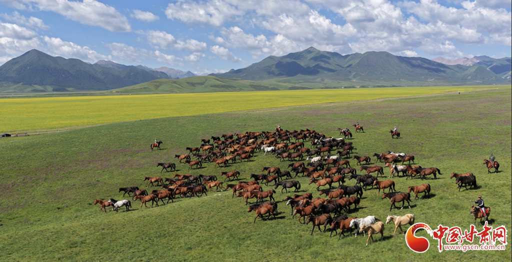 8月12日,在張掖山丹馬場,一場駿馬奔騰的壯闊景象震撼上演。藍天如洗,白云似絮,遠處連綿的山巒勾勒出雄渾的天際線,腳下黃綠交織的草原如巨幅織錦般鋪展。成群棕白相間的駿馬,似靈動音符躍動于綠野,騎手身姿矯健,與奔騰的馬群、遼闊的天地渾然一體,盡顯草原的壯美景象。