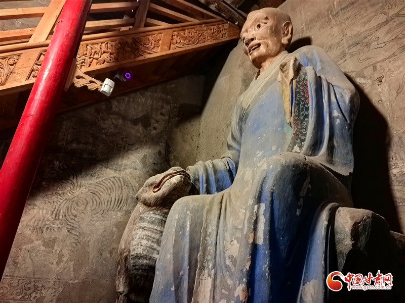 為何要將老虎塑造得如此乖巧?答案就在老虎旁邊的壁畫中。壁畫里的老虎張牙舞爪、張著大嘴,盡顯兇猛之態(tài)。而羅漢手中的老虎卻溫順如貓,這一鮮明對(duì)比,恰恰生動(dòng)地說明了羅漢已將老虎降服。
