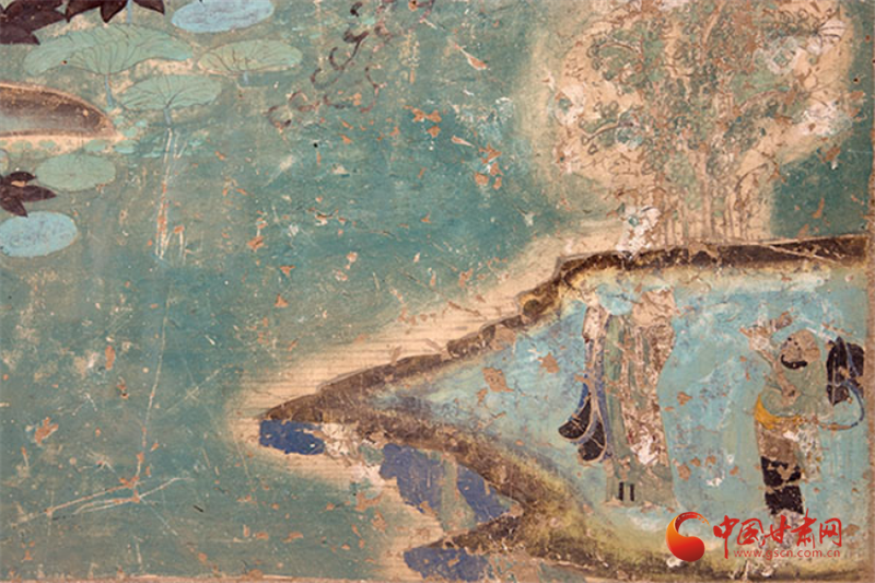 兩幅作品均以青綠色調(diào)為主,觀音面部貼金雖已氧化,卻仍顯清新淡雅,更以“馬一角、夏半邊”的構(gòu)圖巧思,用對角線分割畫面、大量留白,讓有限的壁面生出無窮空間感,堪稱中國傳統(tǒng)美學(xué)與佛教哲理的完美融合——正如唐代白居易贊水月觀音“凈淥水上,虛白光中”,這般意境在榆林窟的壁畫里被演繹得淋漓盡致。