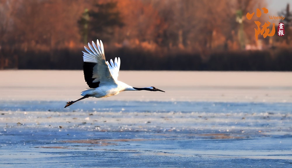 冰面映照著澄澈藍天,丹頂鶴展翅掠水,引頸高歌,清脆的鳴叫聲仿佛是大自然奏響的美妙樂章。