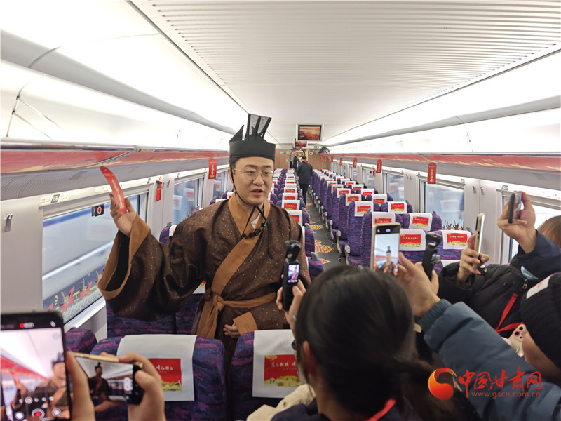 為讓旅客沉浸式感受隴原文脈,22名身著特色服飾的專(zhuān)業(yè)講解員在車(chē)廂間流動(dòng)講解,將文物背后的故事娓娓道來(lái)。